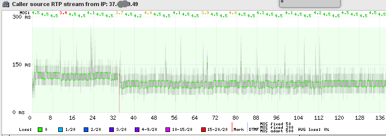 Tedy jitter tam je, náš extra jitter buffer to trochu koriguje (zlepší), ale stále to není ideální kvůli jiným věcem.