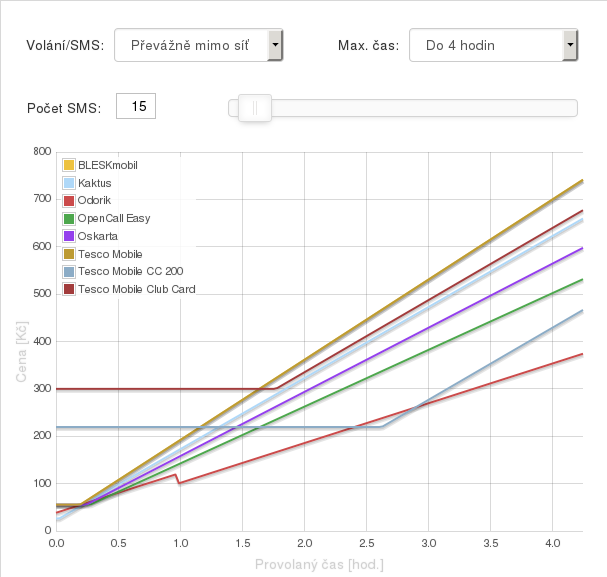 A ještě pořád tahle vylepšená kalkulačka uměle zvýhodňuje balíčky. Neuvažuje totiž o spotřebě pravděpodobnostně, pouze o délce hovorů. Tady je pak vidět, že pravděpodobnostní rozdělení nepoužívají. Dejte si třeba odorik a tesco club card. U odoriku by neměl být skok, ale hladký přechod. U tesca by měla být tak křivka zakulacená.xsouku04 píše:Překvapivé pro mne bylo to, že pokud se vezmou v potaz všechny tyto "detaily", Odorik nevychází vůbec špatně ani s těmi nejvíce cool tarify jiných operátorů.