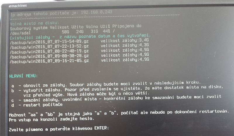 Aktualalizace se dělá jednou za čas ručně. Tedy ráno, když je systém čerstvý, ručně provedu veškeré aktualizace, případně přidám či opravím nastavení aplikací podle požadavků uživatele - např. přidám další tiskárnu. Následně restartuji systém do Linuxu a vytvořím zálohu již aktualizovaného systému. K tomu je právě to textové menu na obrázku. Od toho dne se bude obnovovat již aktualizovaná verze všech aplikací. Nemusím být žádný linuxový ani počítačový guru, abych tohle zvládl - tedy úkol lze zadat kdekomu, kdo se umí držet pár jednoduchých zásad, jako aktualizovat výhradně a pouze jen čerstvě obnovený systém.